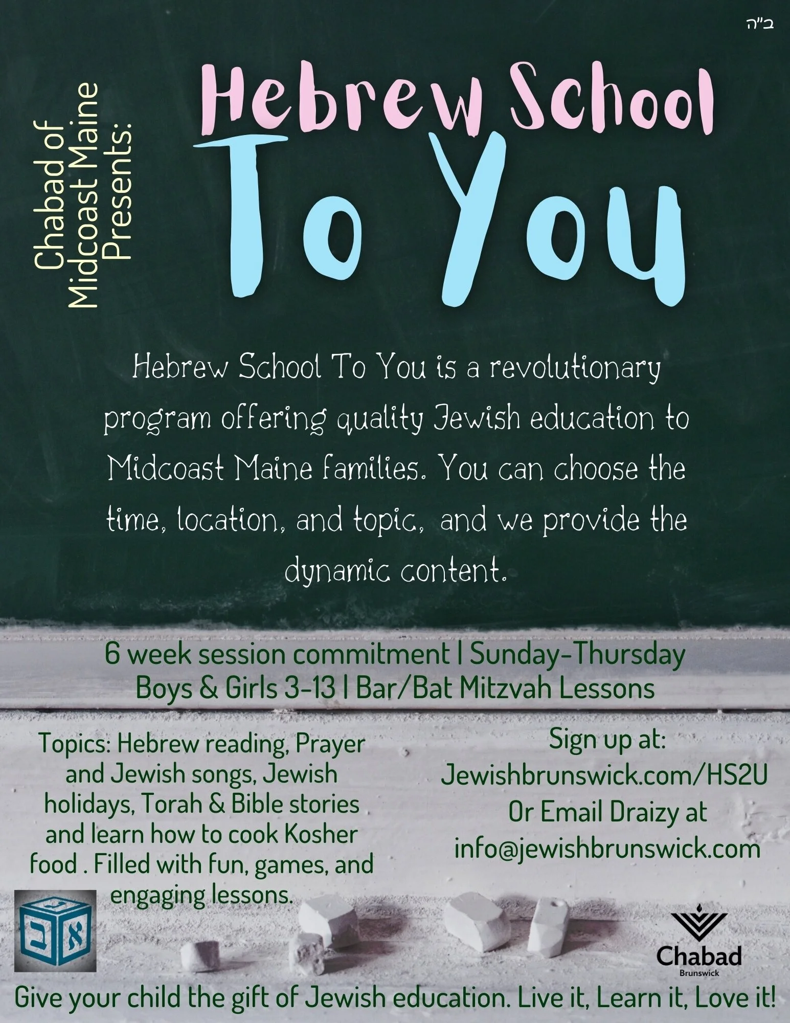 It is a revolutionary program, offering Jewish education to Midcoast families, at the time, and location of YOUR choice. You can choose private sessions, or we can pair your child up with a small group of similar age and interests.